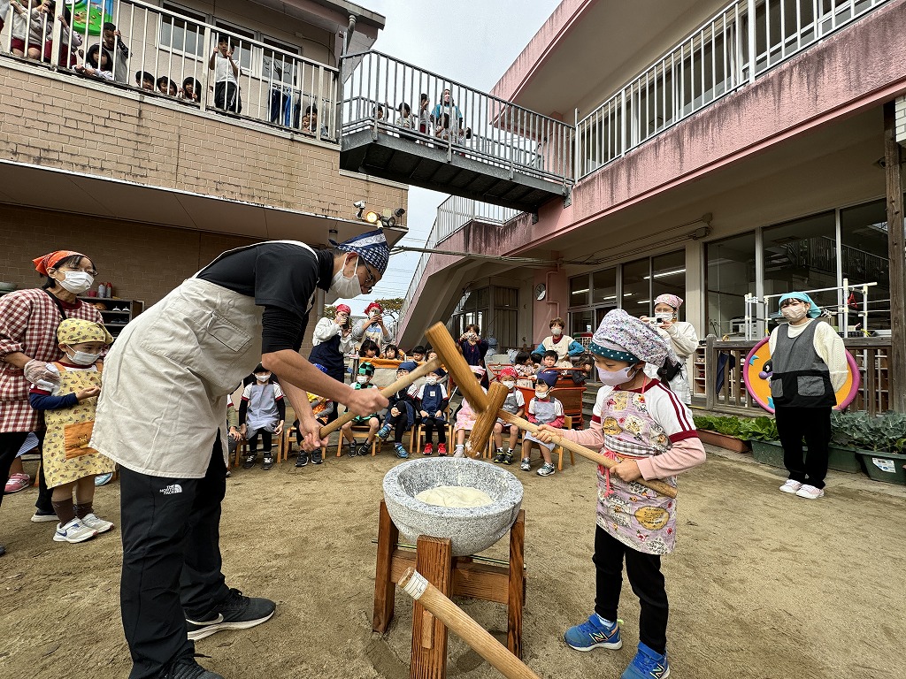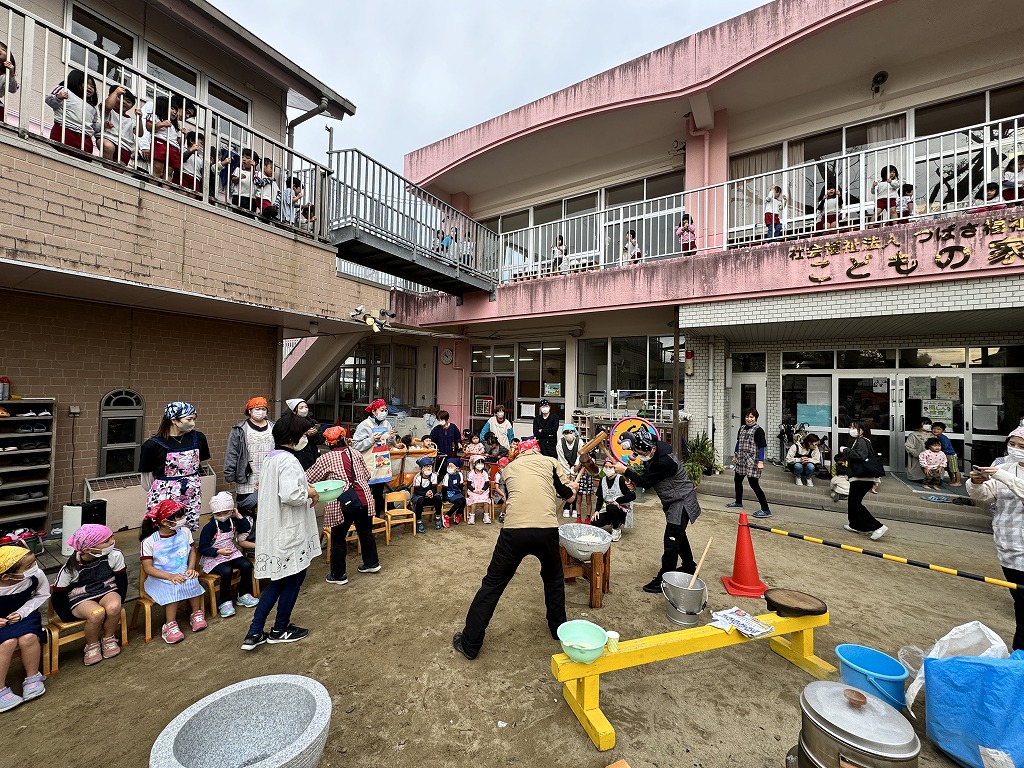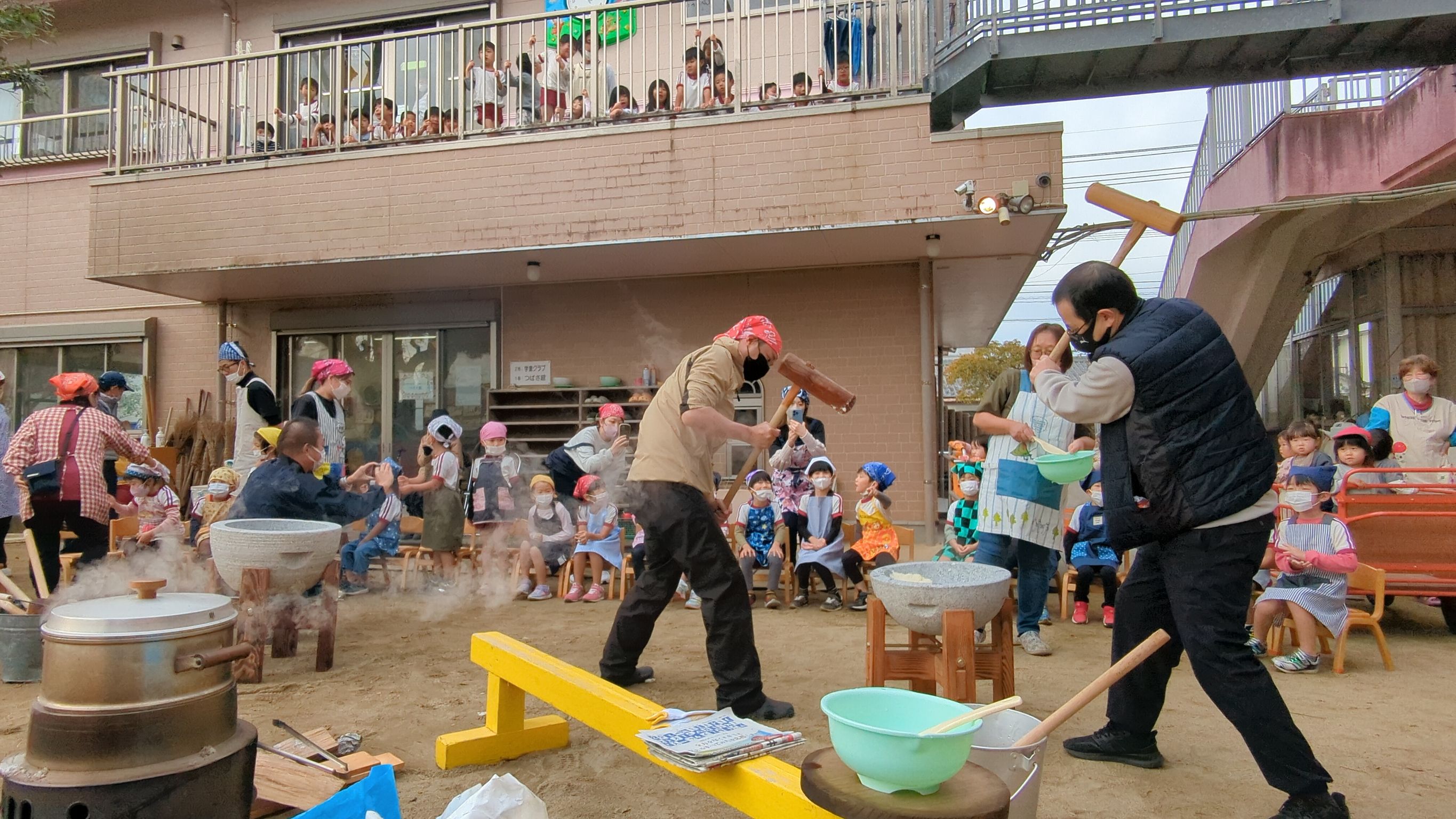 当園では、消費者庁より餅による窒息事故防止の注意喚起が出されている観点から、おもちつき大会でついたもちを食べることは控えておりますが、子ども達に伝統行事に触れてもらうことを目的に、もちつき大会を実施し鏡餅として飾らせていただいております。