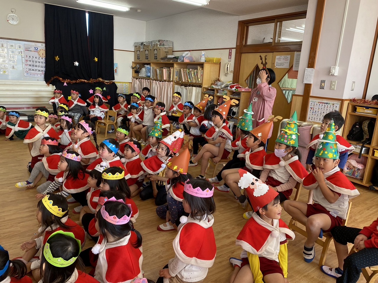 合同クラス(3歳児・4歳児・5歳児)クラスでは、事前の活動で製作した、クリスマスティアラを被り、ケープを身に付けサンタクロースの登場を「わくわく・どきどき」しながら待ちました。