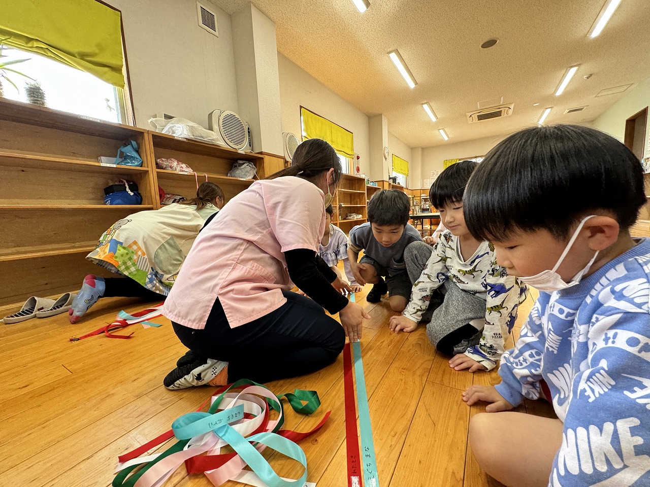 看護師指導の下、聴診器を使って自分の心臓の音を聴いたり、生まれてから身長がどれくらい伸びたのかを感じてもらうため、出生時身長の平均(50cm)と1月の自分の身長と同じ長さに切ったリボンを使って、視覚的に成長を感じてもらいました。