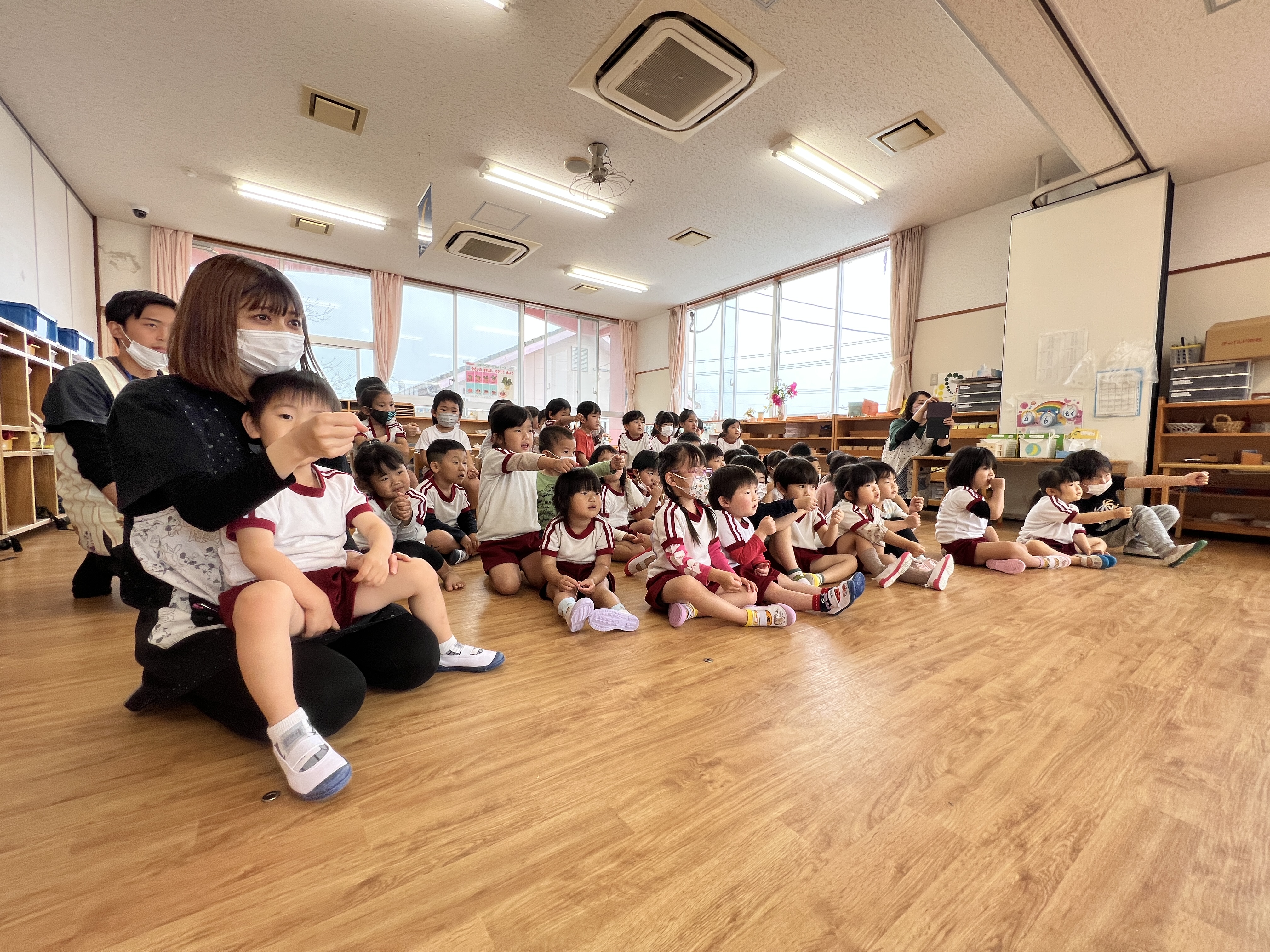 合同クラス(3歳・4歳・5歳)に今月から入園した園児の入園を祝う会を開催しました。 新しいお友だち4名は、みんなの前で緊張しながらも、自己紹介をしてくれました。