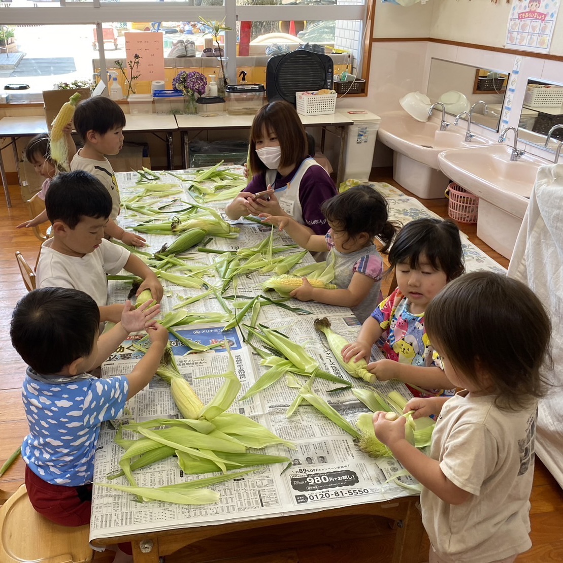 大桃組(2歳児クラス)で「とうもろこし」の皮むきをして、おやつとしていただきました【食育活動】