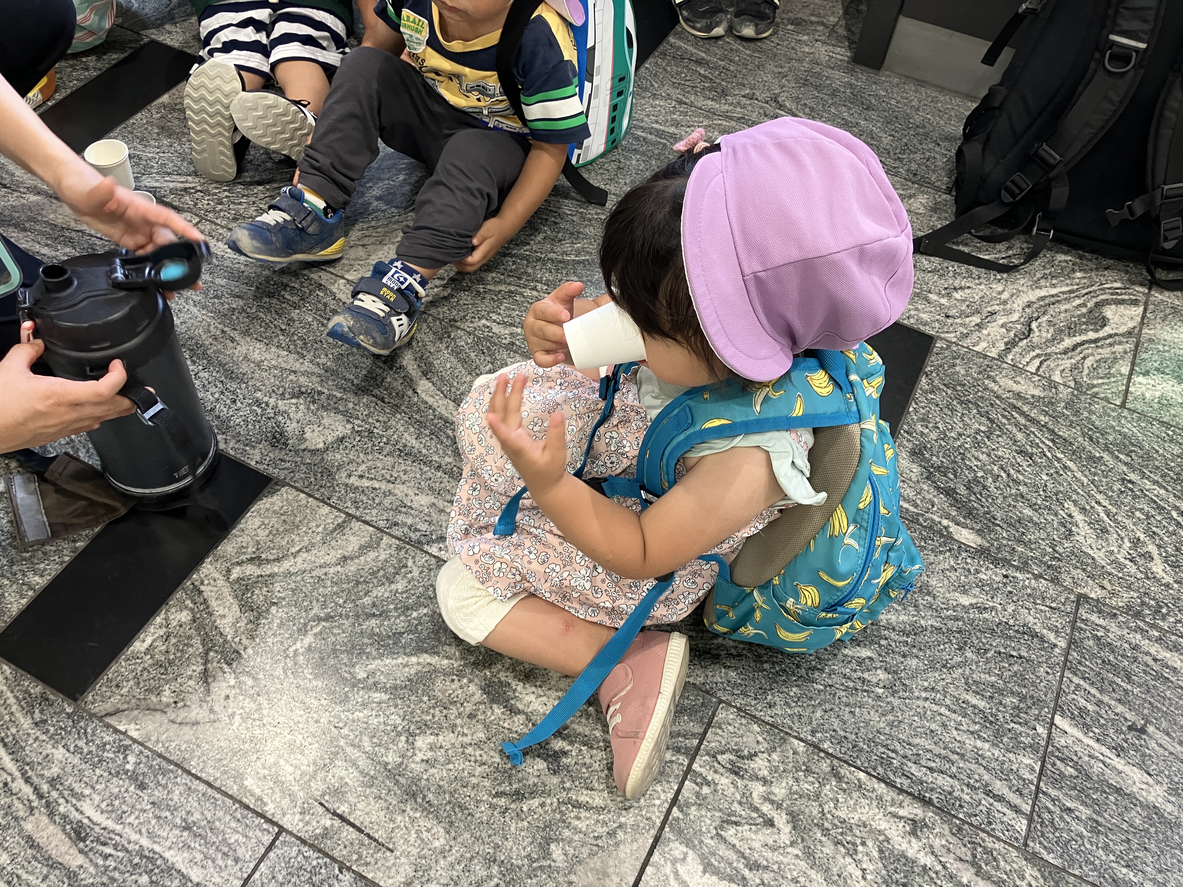 博多駅に到着すると、子どもたちは「新幹線どこかな?👀」と、ワクワクが止まらない様子! 新幹線乗り場の前で少しお茶休憩をして、いよいよ新幹線とご対面です!🙌