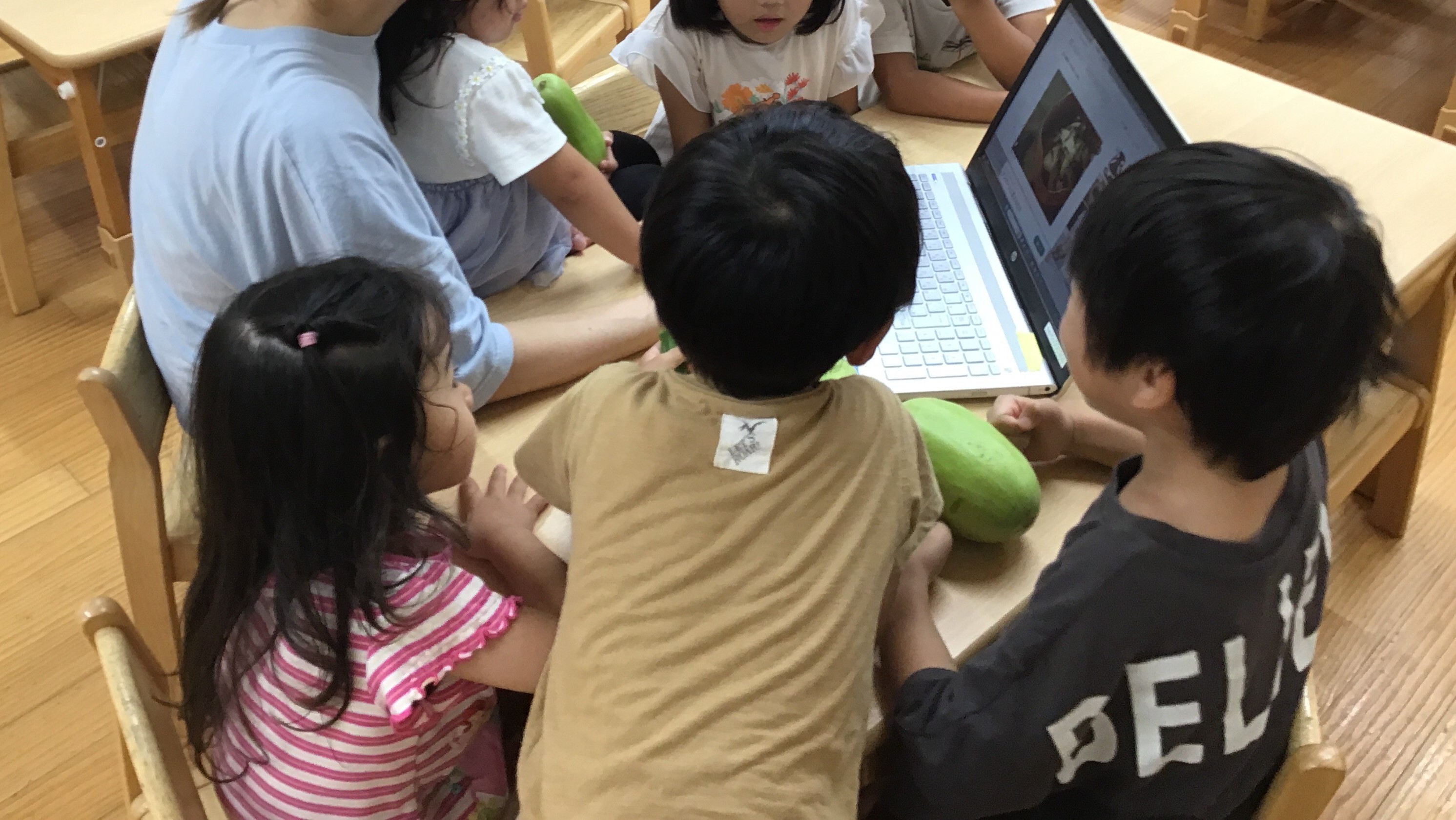 その後、小さい子たちは「どんな野菜かな…」と図鑑を使って調べ、大きい子たちは「どうやって食べる?」とインターネットでレシピを調べていました。