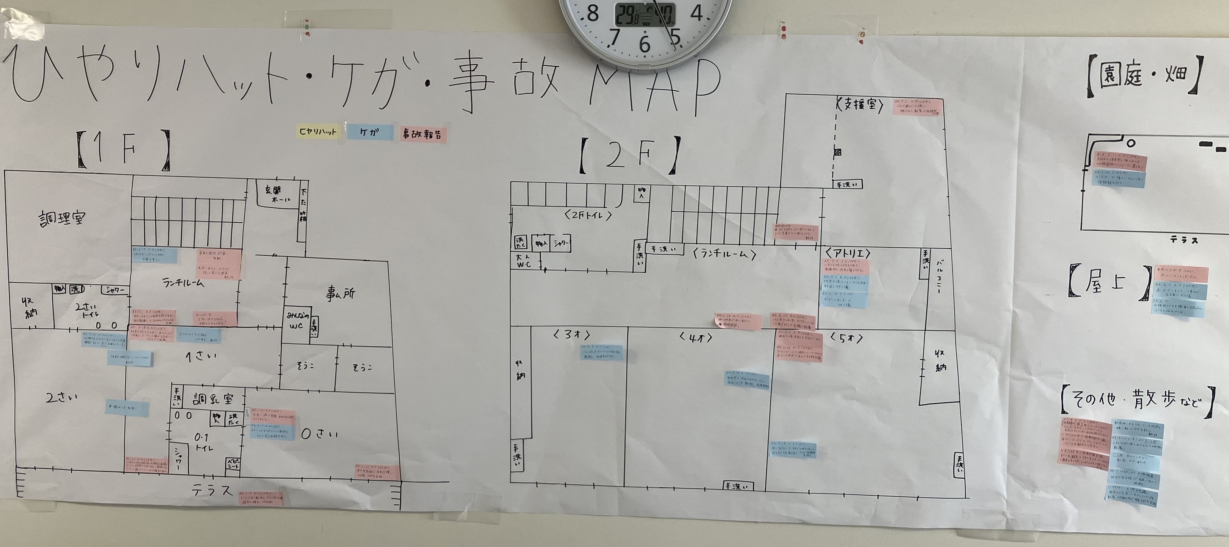 とは言え、防げる怪我は対策をしていくことが大事…ということで、ヒヤリハットや怪我、事故が起きやすい場所をマップにして職員で共有する取り組みをしています。
