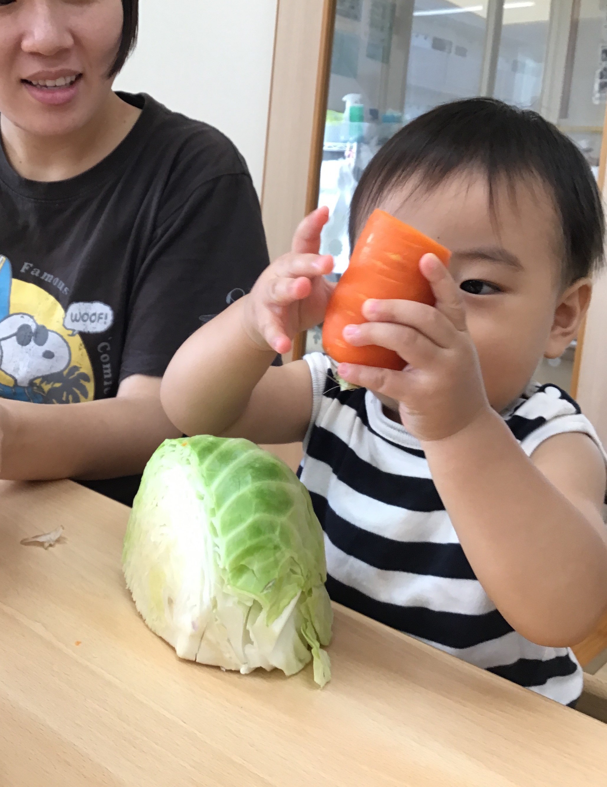 0歳児クラスでは、お野菜に触れてみようということで人参やキャベツ、玉ねぎで遊んでみました。