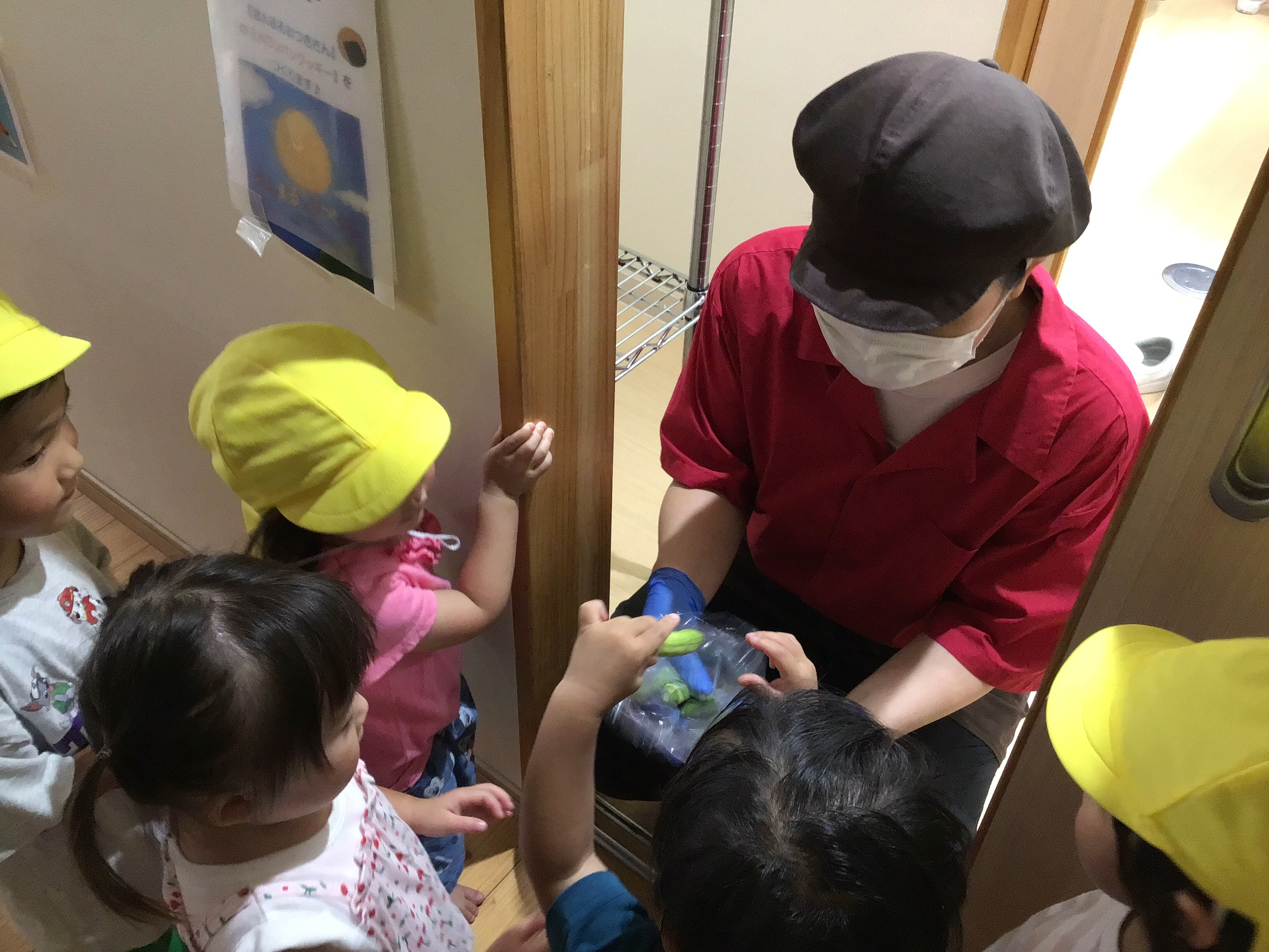 先日は収穫したゴーヤを「どうやって食べる?」と相談し、「ドーナツみたい!」ということで、輪切りにしたゴーヤを子どもたちが種とワタを取り、リング状にして給食室で天ぷらにしてもらいました。