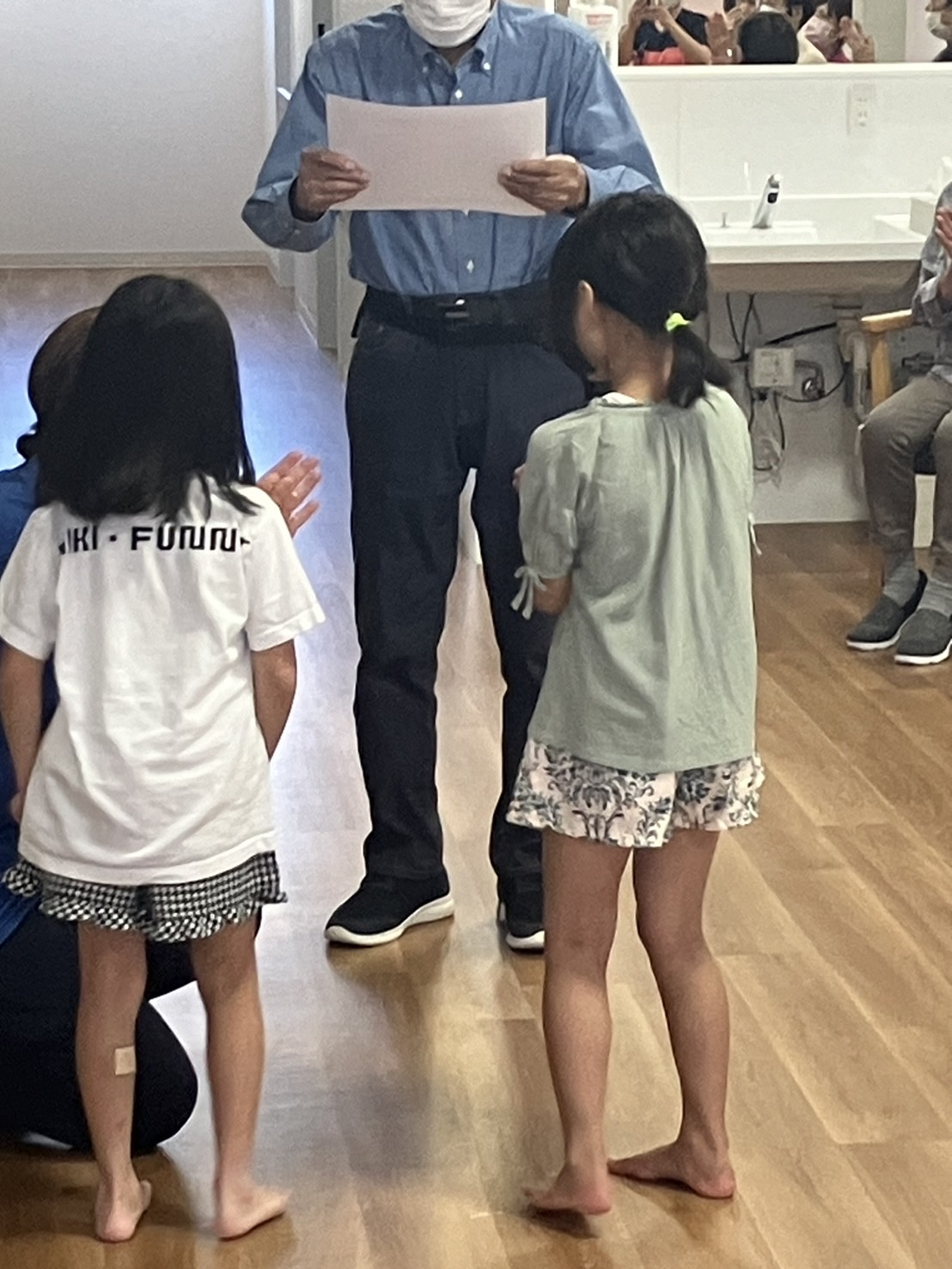 みんなでいつもの体操をしてから、ダンスや歌を披露し、みんなで作った手型アートをプレゼントしました。