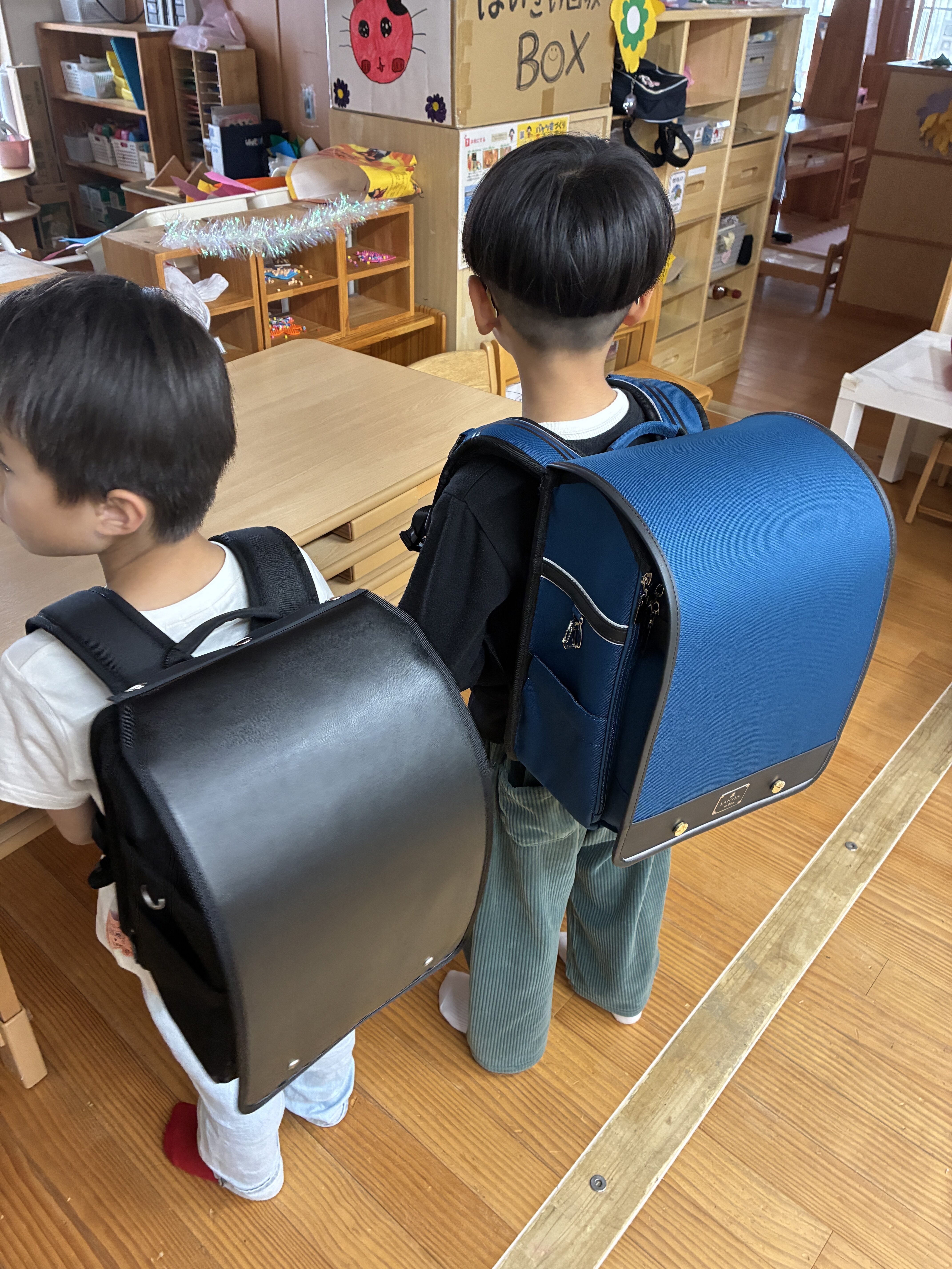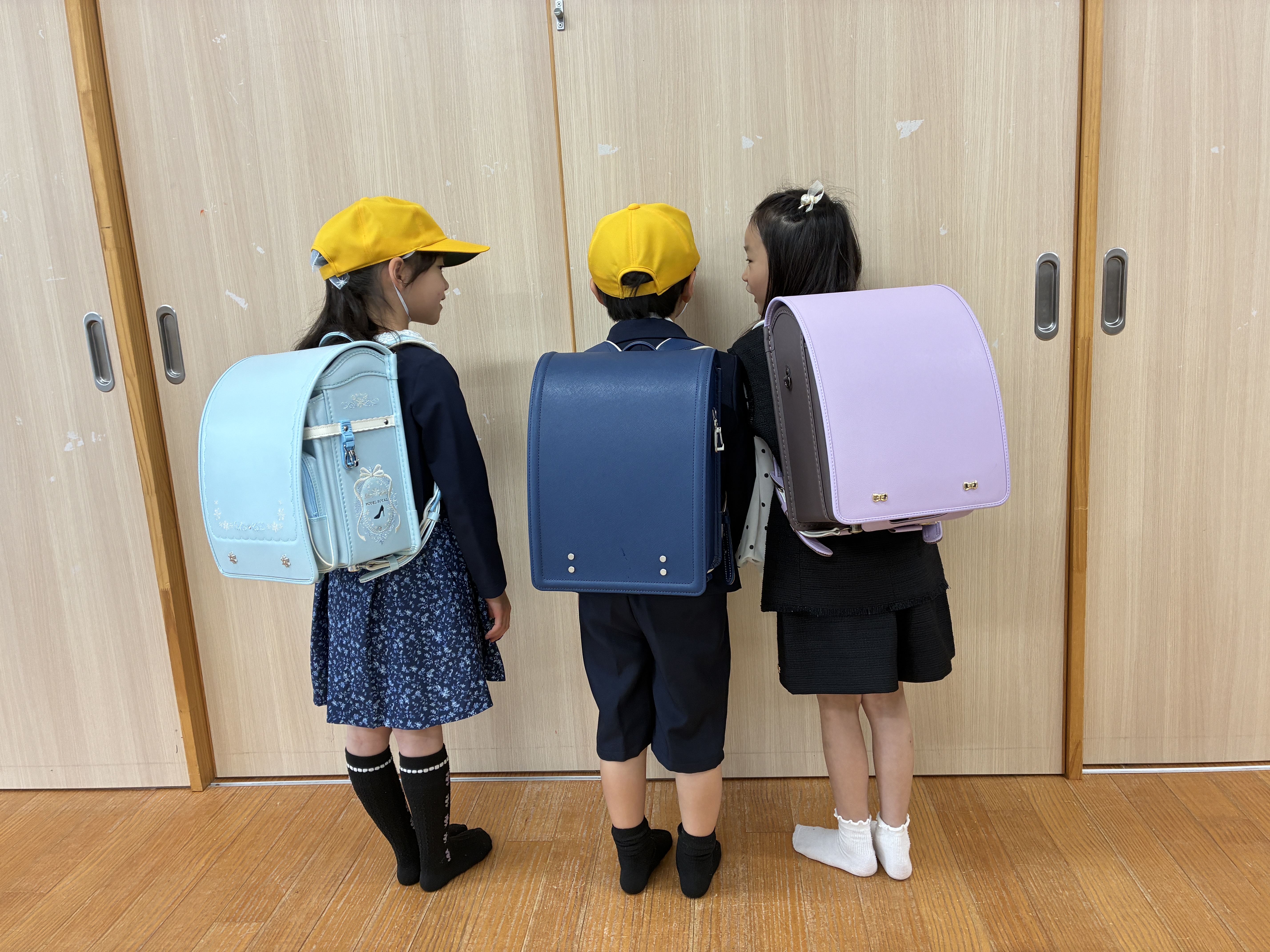 入学式を終えた後、数名の卒園児がピカピカのランドセル姿を見せに、園に遊びに来てくれました。