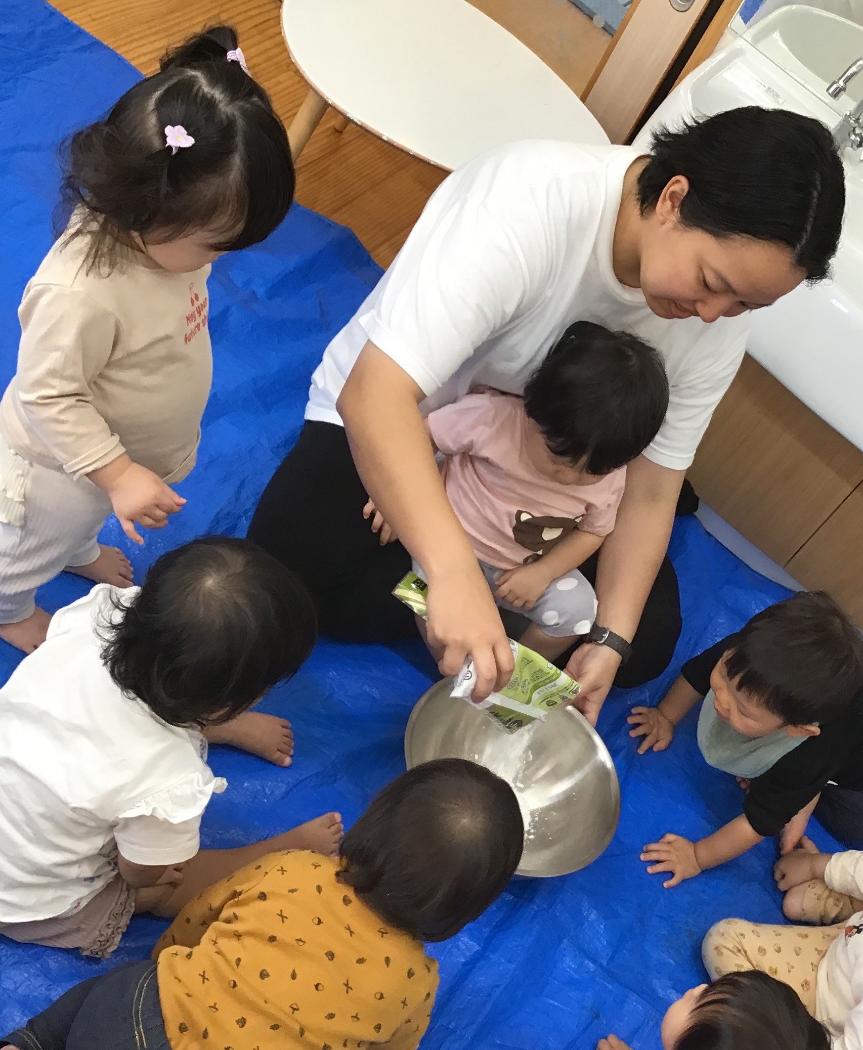 0歳児クラスで、白玉粉の感触遊びをしました。