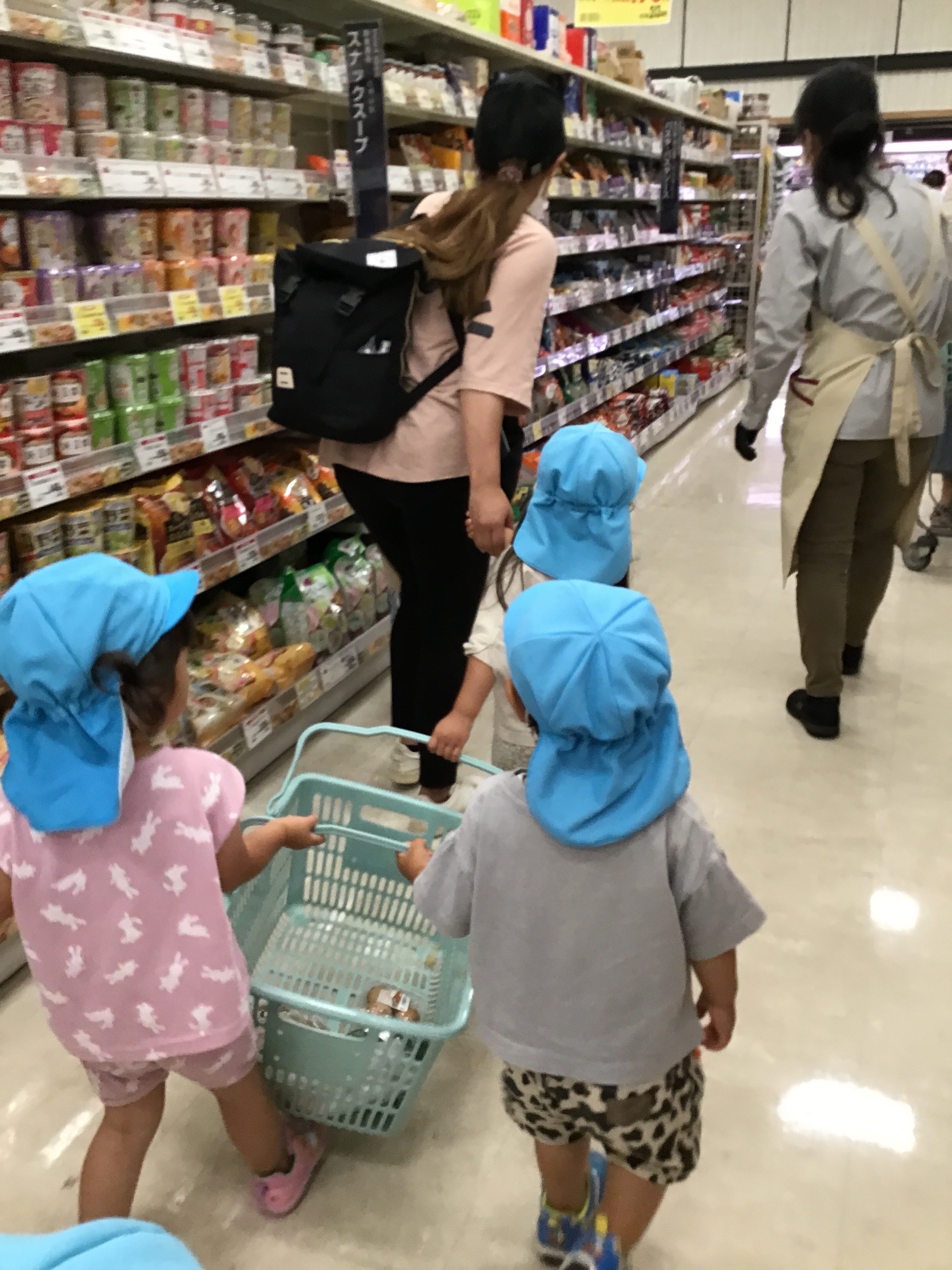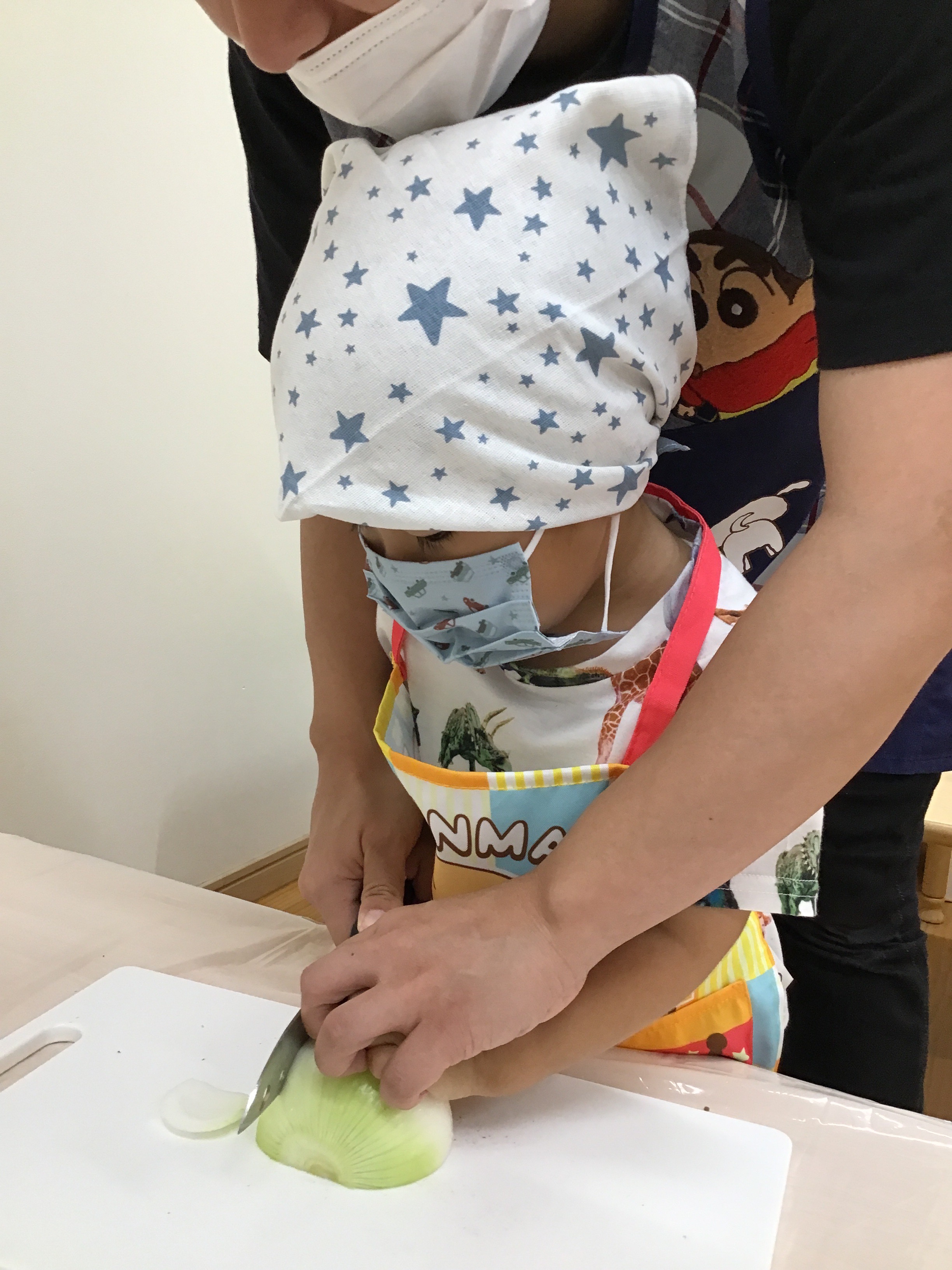 絵本「ワタナベさん」を読んで、「ナポリタンが作りたい!」という声が上がり、作りたい子が集まって、必要な材料を話し合い、買い物に行って、クッキングに挑戦しました。