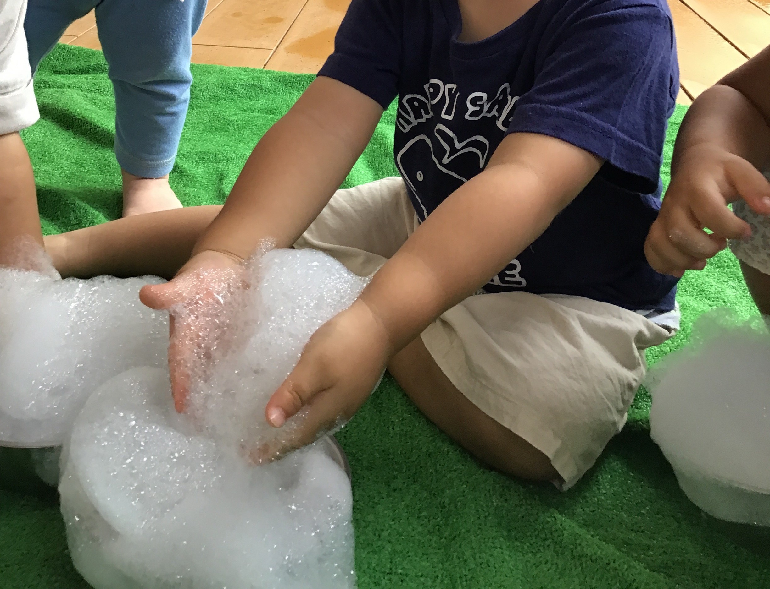 暑くてなかなか外に出られない時には、泡遊びやスライム作りを楽しみました。