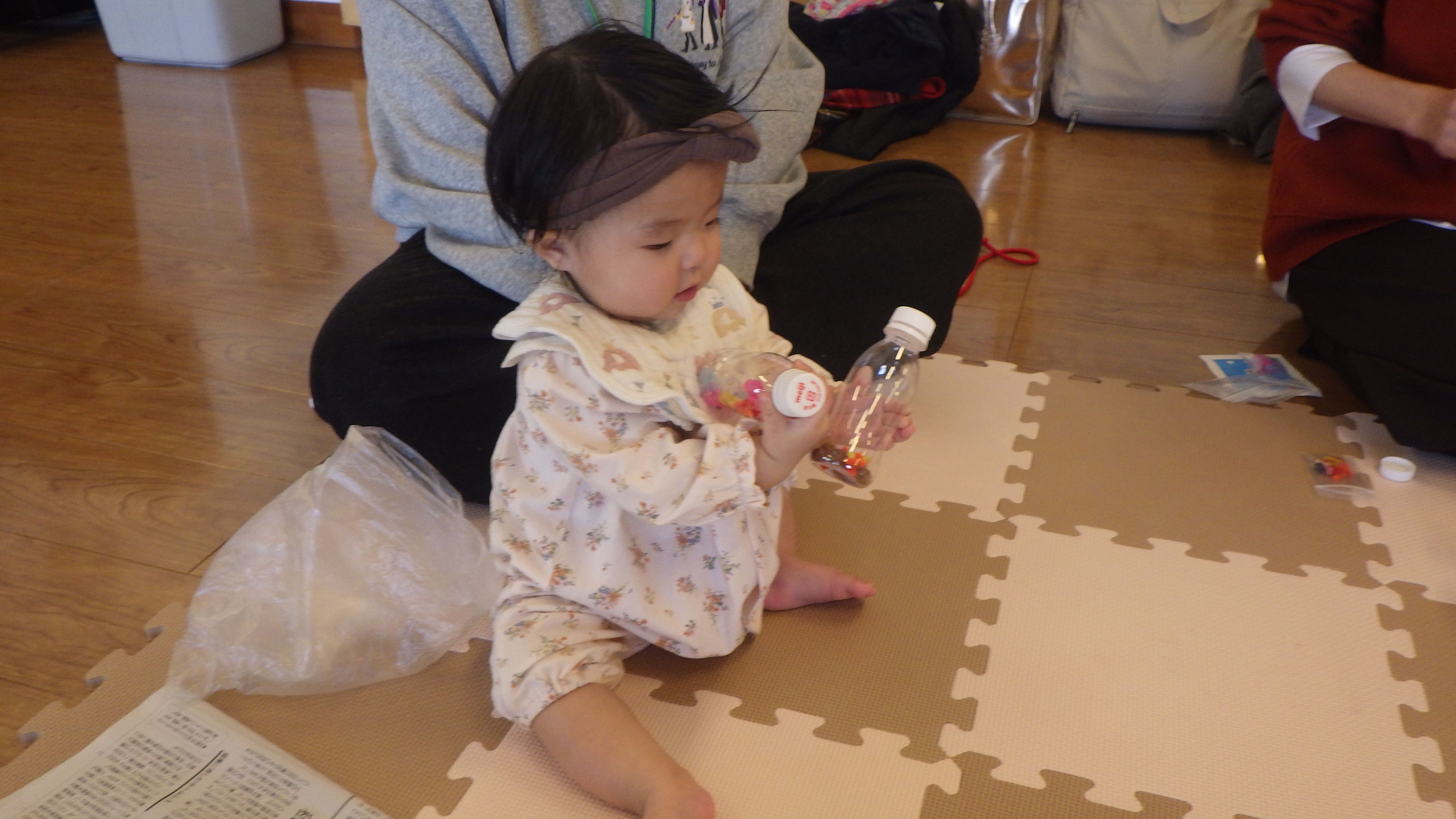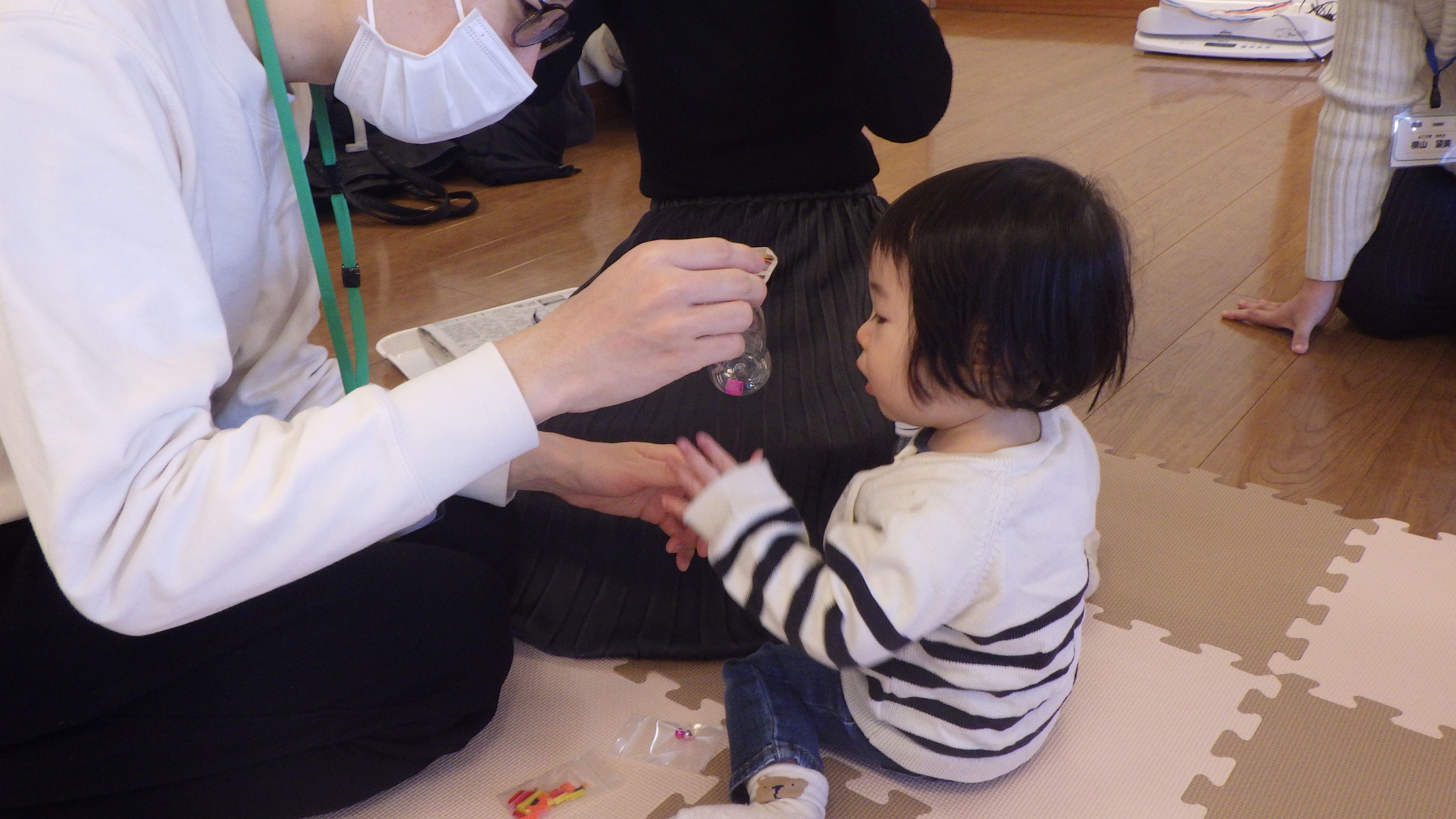 パパ・ママと協力しながら素材を指でつまんでペットボトルに入れるとカラフルなマラカスが完成しました🎶