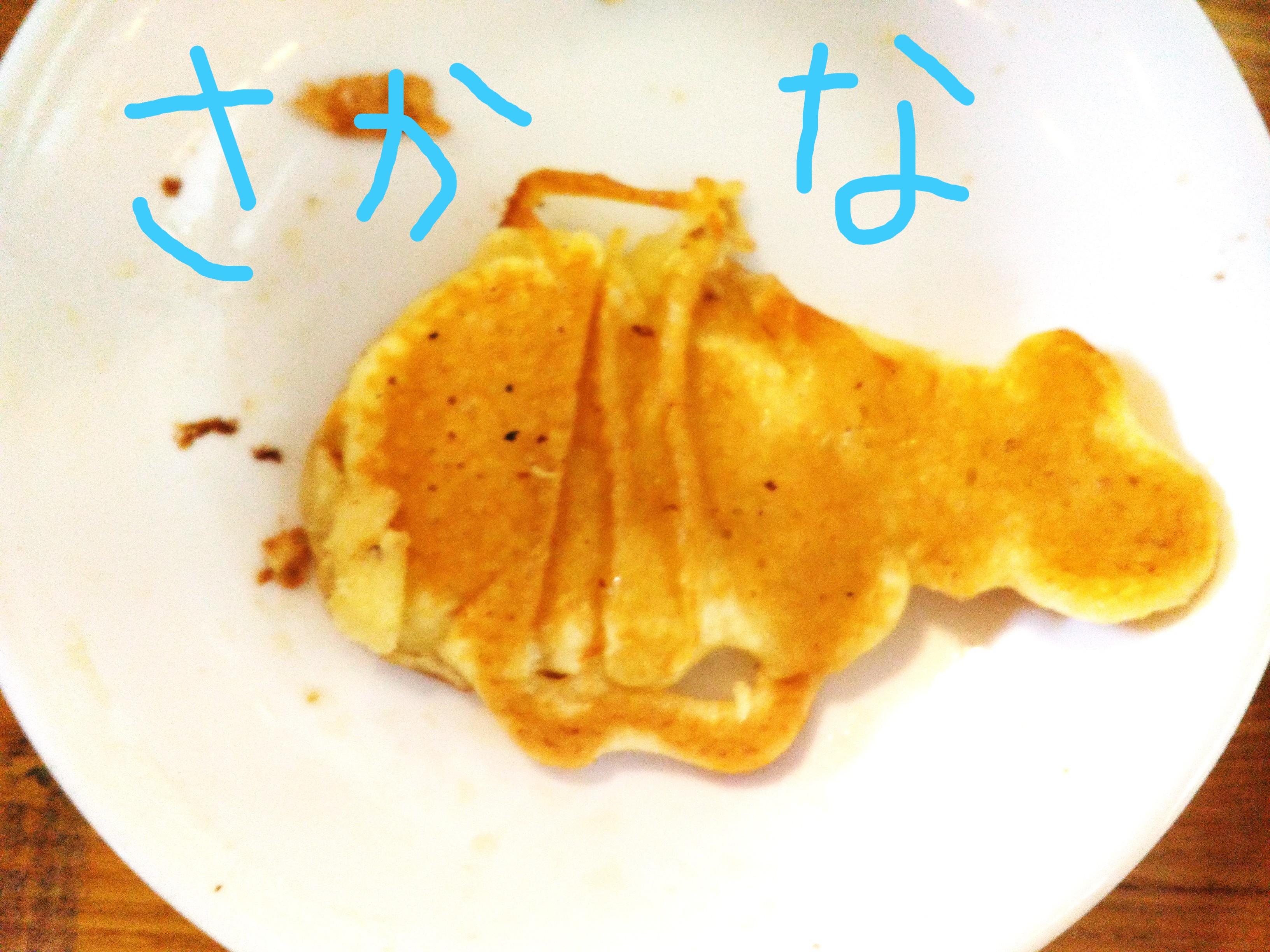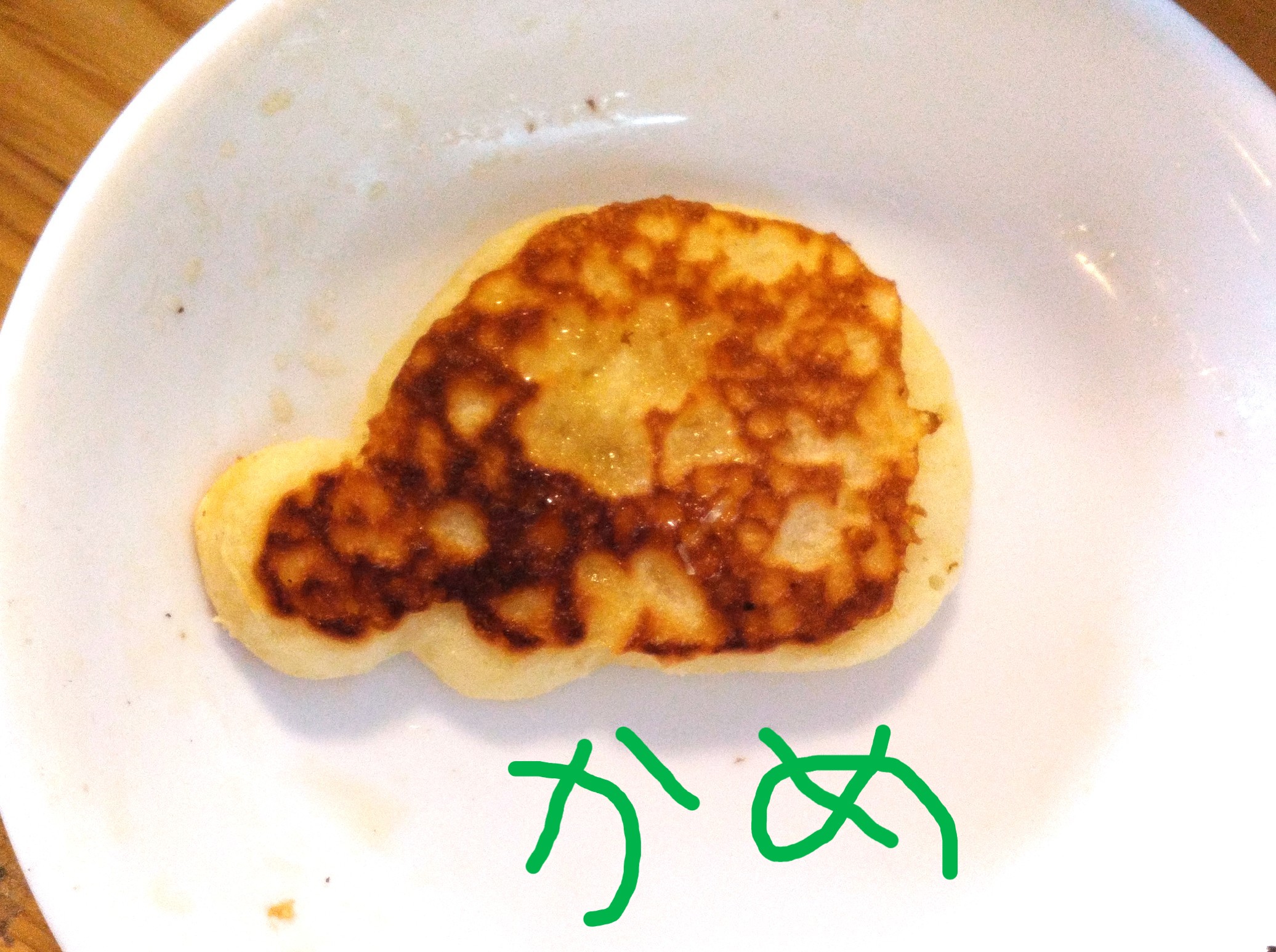 出来上がったホットケーキの形は、園で飼っている亀や魚に似ていると大盛り上がりでした。
