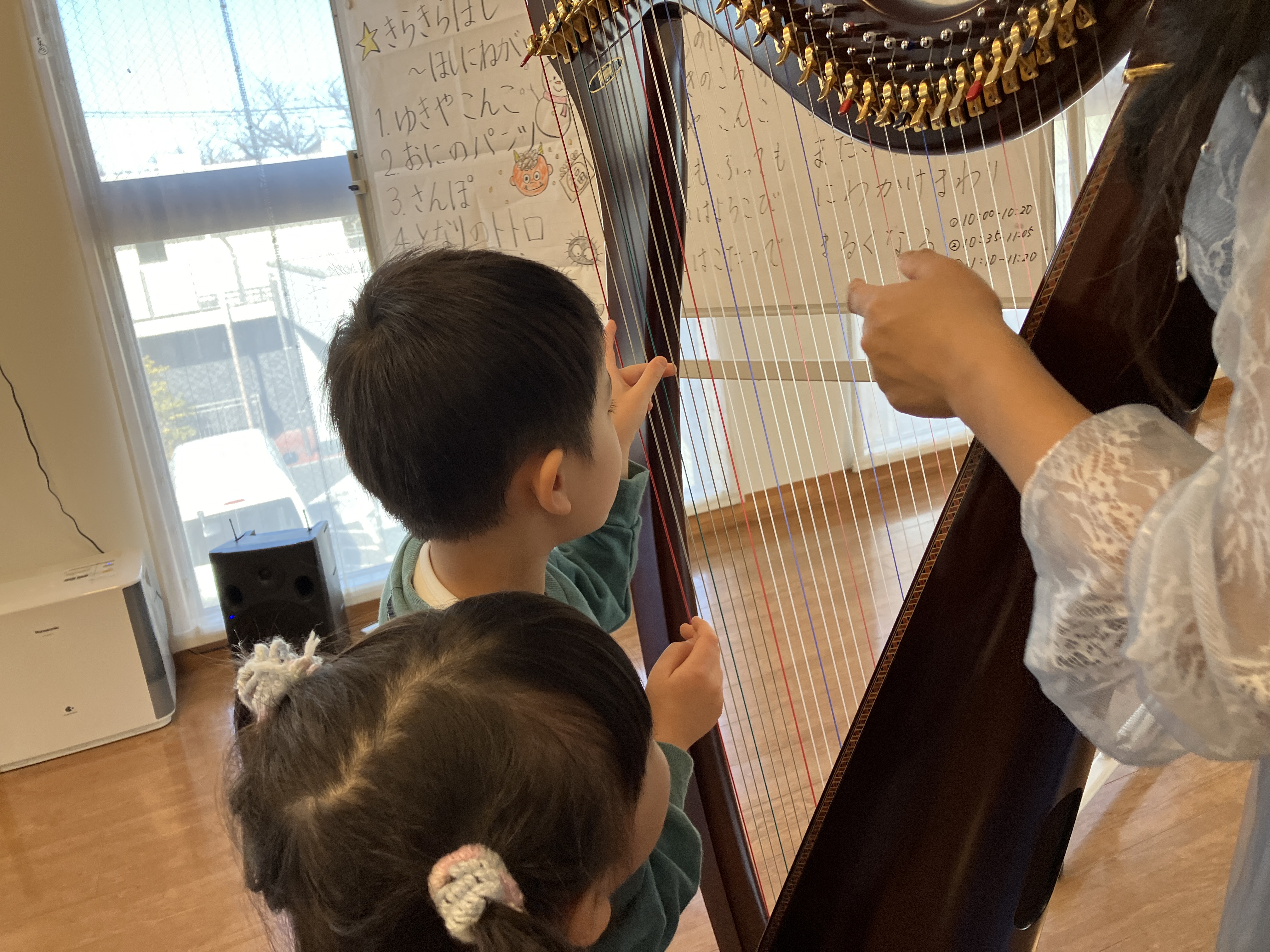 アイリッシュハープの演奏者の方が園に来園してくださり、本物の楽器の美しい音色に触れる体験をしました。演奏の後はご厚意により、年長自は楽器に触れさせていただきました。
