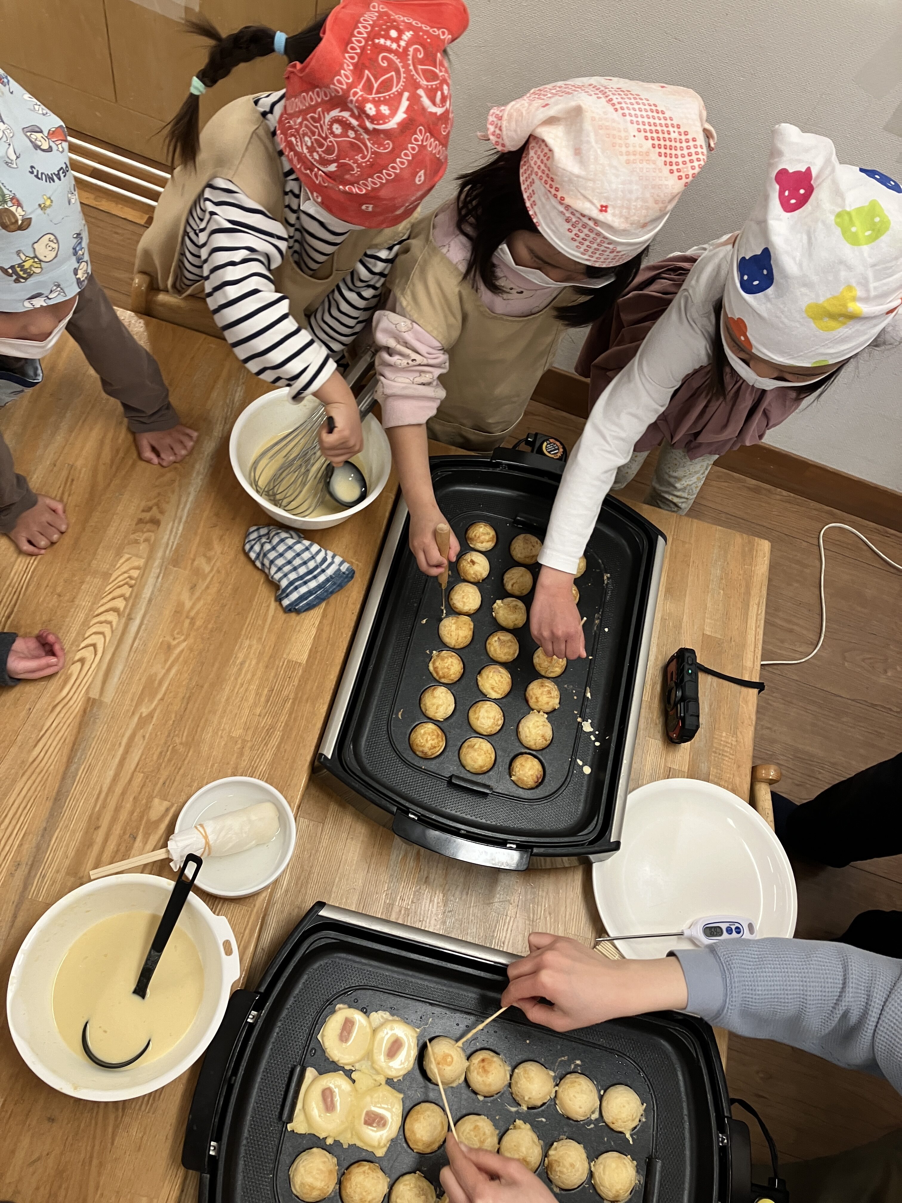 今年度の春にままごとを楽しんでいた数名の子どもたちの遊びが、秋頃からお店屋さんごっこに変わってきました。そこで11月に板橋のイオンへいきフードコートを見学しました。子どもたちはたこ焼き屋さんに興味津々の様子。園に戻ると画用紙や厚紙や絵の具を等持ってきてたこ焼きを作りごっこ遊びが始まりました。そして12月のお楽しみ会では、保護者の方にお客さんになっていただき、自分たちが工作したものでたこ焼き屋さんをしました。こうなってくると本物のたこ焼きをやりたくなり、厨房に相談してたこ焼きづくりをしたい子どもが集まりたこ焼きづくりを行いました。本物のタコは子どもには切りにくく、サイズによってはのどに詰まる恐れがあったので、ウインナーを買ってきて対応。子どもたちが一つひとつ包丁で切ってタコさんウインナーにしました。たこ焼き80個出来ました。とってもおいしかったそうです。