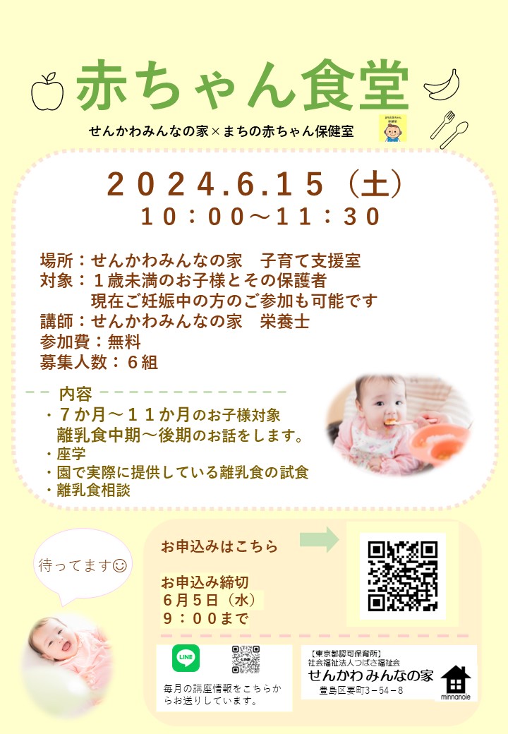 【地域子育て支援】まちの赤ちゃん保健室 赤ちゃん食堂 6月15日(土)のご案内